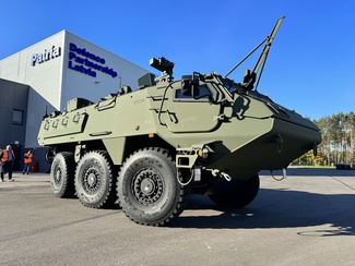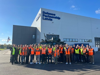 ![]() Patria 6x6:n takana on Patrian Latvian-tuotantolaitos. |