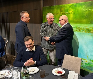 ![]() AuLin puheenjohtaja Pentti Rönkkö ja sihteeri Pekka Virtanen kiittelivät illallisen yhteydessä Vehon pr-päällikköä Pekka Koskea, joka oli nyt viimeisen kerran mukana AuLin seminaarimatkalla. |