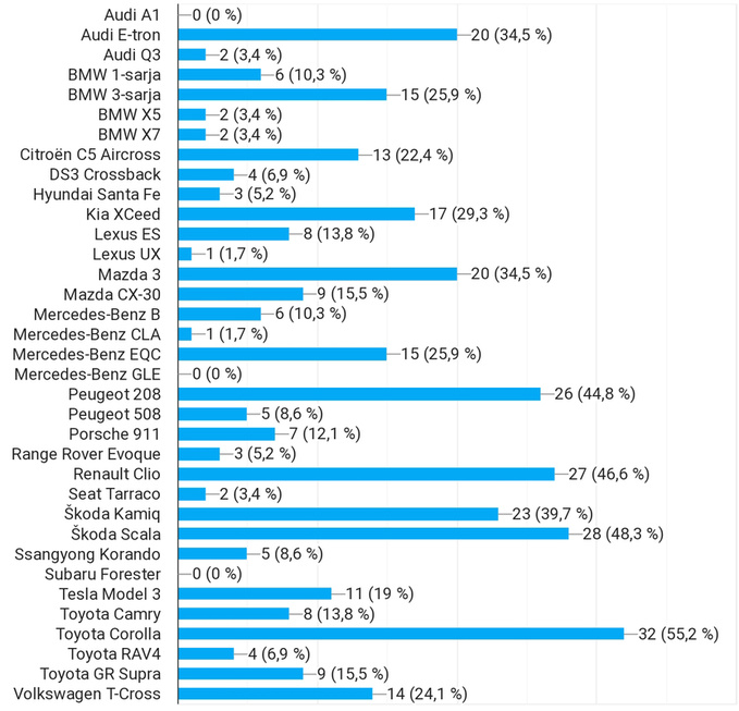 Vuoden Auto Suomessa 2020:n ensimmäisen kierroksen tulokset.