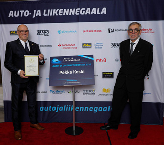 ![]() Pekka Koski vastaanotti Vuoden auto- ja liikennetiedottaja -tunnustuksen AuLin vuoden 2020 puheenjohtajalta Clas von Belliltä. Kuva: Aki Havukainen |