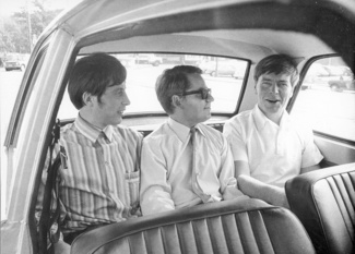 ![]() Historiallisessa kuvassa takapenkkiä testaavan kolmikon oikeassa laidassa on Tapani Vaahtola. |